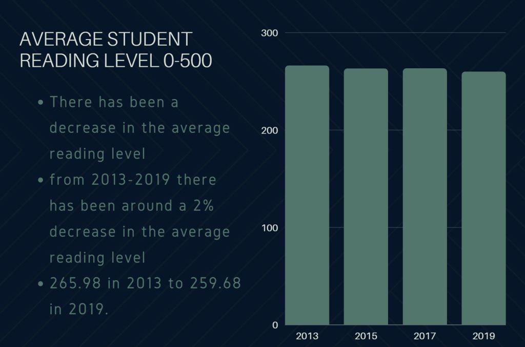 Math should not be the only area of focus. Reading levels and writing abilities need to also be examined. It is difficult for non-math teachers to positively impact their student’s math scores, but they can however hopefully teach reading and writing. To determine how to do this, we need to first know if what we’ve been doing has worked. Below is a graph depicting the average reading level for 8th grade students in Delaware.